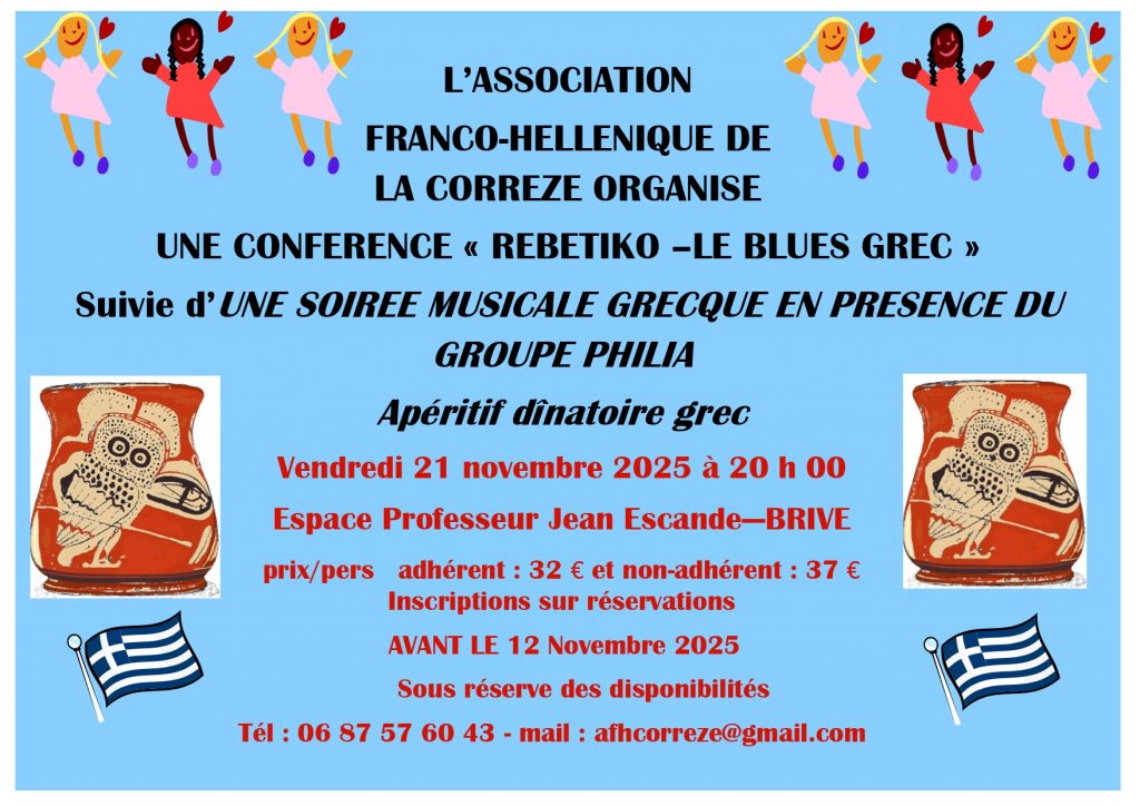 L’association franco hellénique de la Corrèze organise le vendredi 21 novembre 2025 à 20h une soirée grecque.