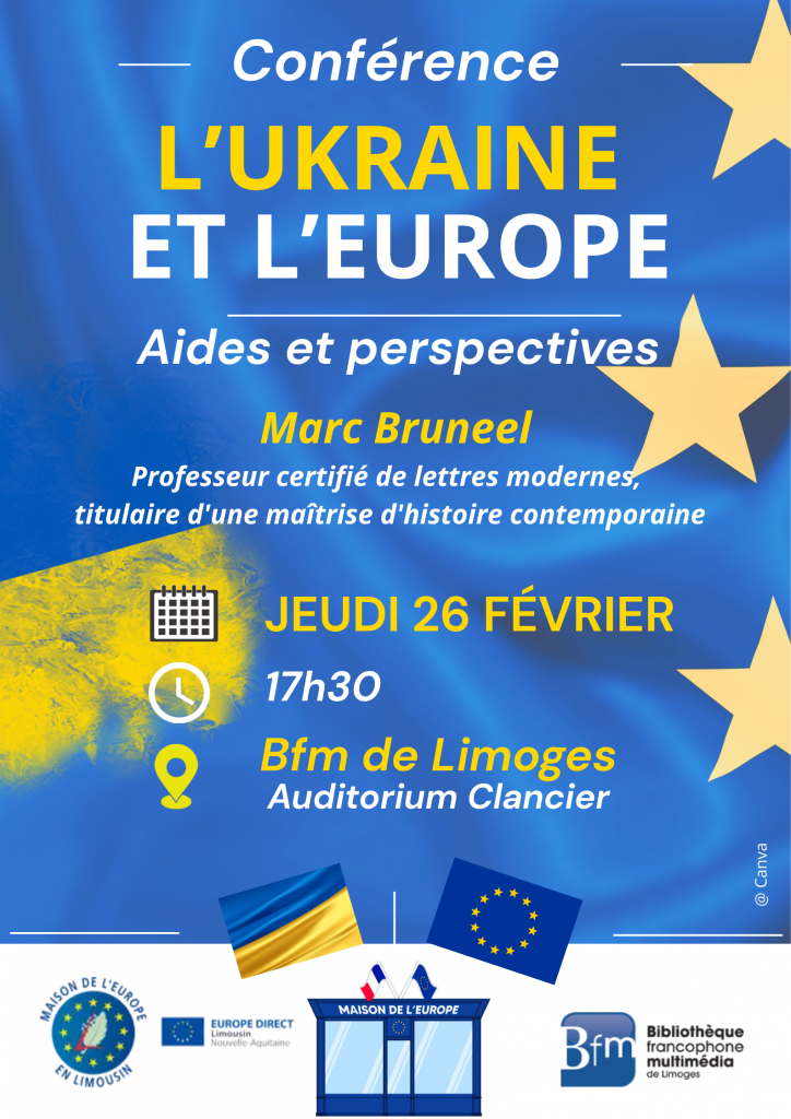 A l’occasion de ces quatre années de conflit, la Maison de l’Europe – EUROPE DIRECT Limousin propose de faire le point et organise une conférence exceptionnelle intitulée « L’Ukraine et l’Europe : aides et perspectives », le jeudi 26 février 2026 à 17h30, à la Bfm de Limoges, dans l’auditorium Clancier.